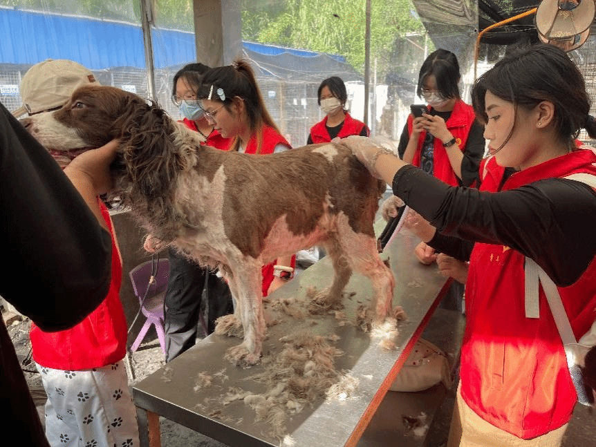 志愿者们正在给宠物修剪毛发