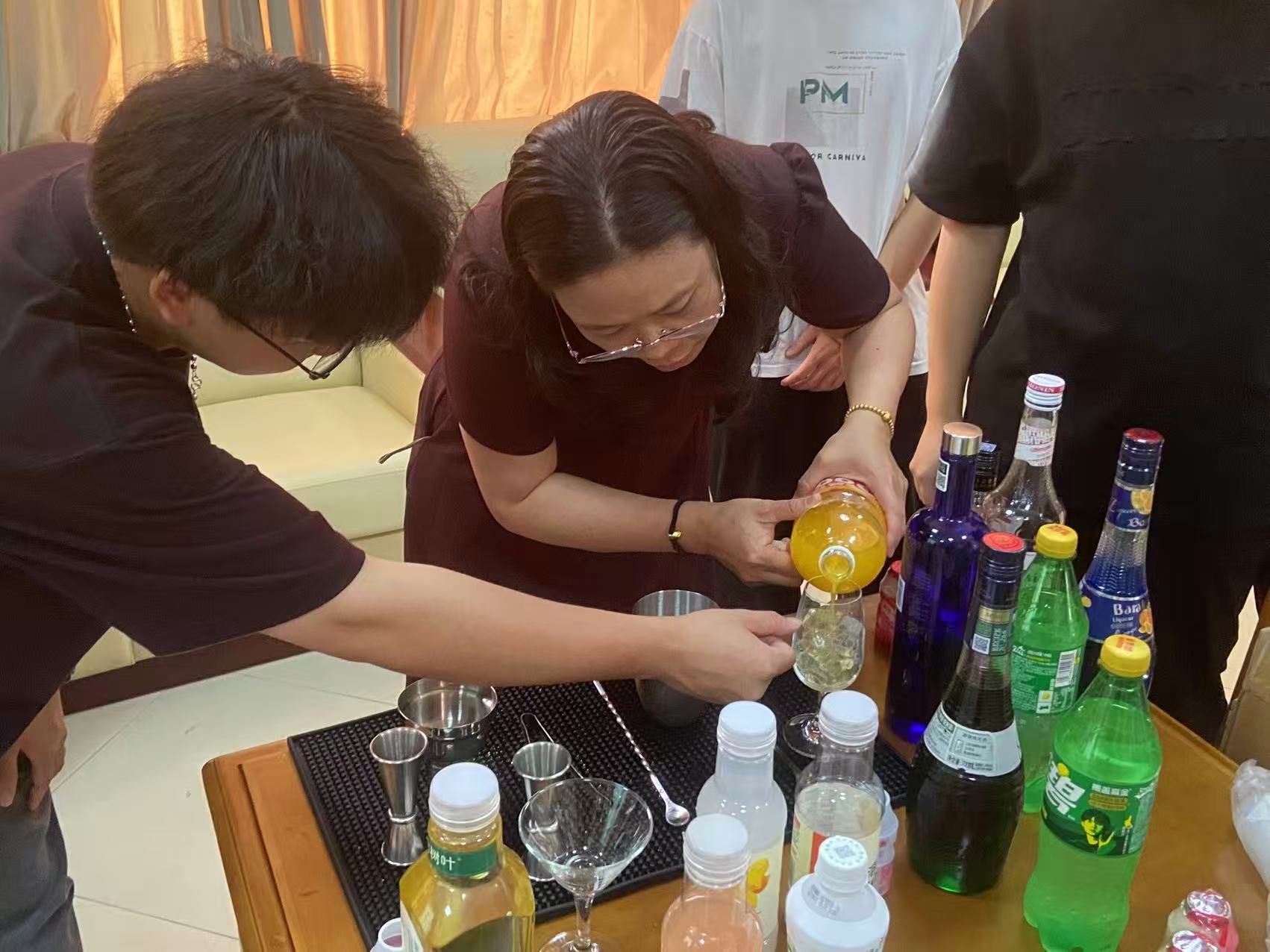最热闹的环节来了!职工们化身“调酒师”,在“基酒比例调配”“分层技法掌控”等环节中各展所长,现场欢声笑语不断,交流讨论热烈。老师们发挥创意,调制出了独具个人特色的饮品,将活动推向高潮。
